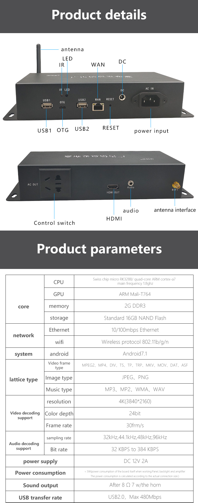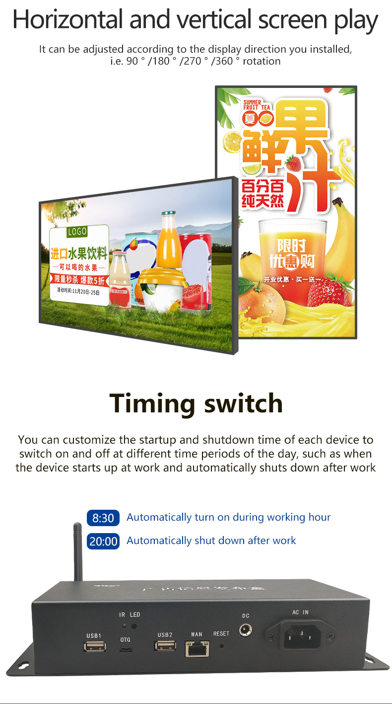- Product model: XTA3288UP Multimedia TV advertising player information release box remote control split screen Android system horizontal screen vertical screen store unified release of the playback box 4K 2+16